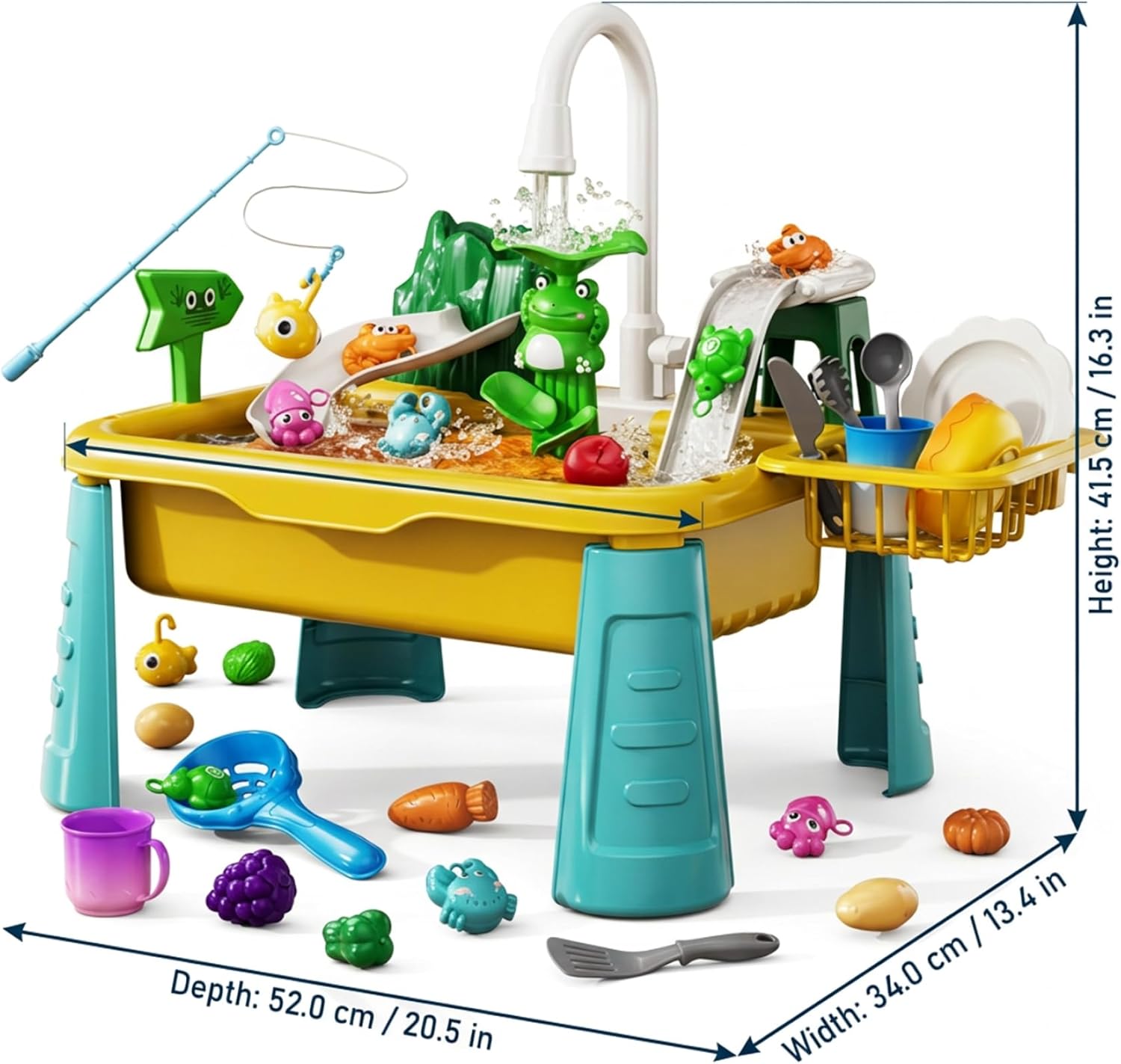 Description: This Play Sink with running water provides a dynamic and realistic water play experience, designed to foster imaginative and sensory play for toddlers both indoors and outdoors. Equipped with vibrant color changing fish and an interactive fishing game, this electric toy sink stimulates hand-eye coordination and keeps children engaged in creative pretend play. Crafted from sturdy, materials, it ensures long-lasting use and safety for little hands during water activities. The versatile design includes essential play kitchen accessories, expanding opportunities for make-believe scenarios, enhancing social skills, and promoting tactile exploration. Easy to set up and clean, this toddler water table combines functionality and fun, making it an ideal addition for active kids who love water play while giving parents peace of mind with its user-friendly maintenance. Features:. -Color: Yellow. -Material:ABS. Note:Manual measurement, please allow slight errors on size.The colors may exist slight difference due to different screens. Package Including 1 * Play Sink with Running Water