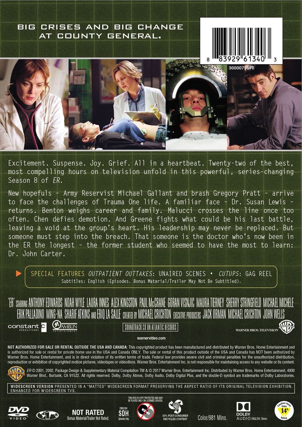 ER: The Complete Eighth Season (Repackaged/DVD)"ER" provocatively explores the chaos of an urban, public hospital emergency room and the lives of its devoted doctors and staff. Attending Physician Dr. Mark Greene forms the emotional backbone of the emergency room… Combining the extraordinary talents of best-selling author Michael Crichton with Peabody, Humanitas and Emmy-winning producer John Wells and Steven Spielberg's Amblin Television, the multiple Emmy Award-winning "ER" provocatively explores the chaos of an urban, public hospital emergency room and the lives of its devoted doctors and staff.]]>