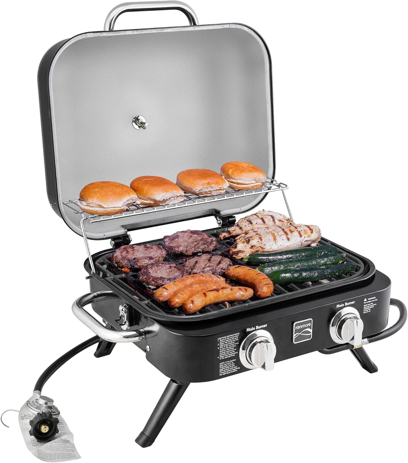 Elevate your outdoor cooking experience with the new Kenmore 2-Burner Retro Portable Gas Grill. This two-burner small propane gas grill is designed for on-the-go grilling excellence, boasting a generous 343 square inches of barbeque grilling surface—perfect for sizzling up to 9 burgers at once. With its sleek retro design and tabletop versatility, this small compact BBQ grill not only delivers style but also functionality. Equipped with flamethrower ignition and a warming rack, the Kenmore 2-Burner portable grill offers a total of 14,000 BTUs of cooking power. Its compact size and side handles make it an ideal companion for camping, glamping, tailgating, outdoor adventures, parks, picnics, and BBQs on the go. Whether you're embarking on family escapades or celebrating outdoor events, this portable outdoor gas grill ensures a memorable and flavorful experience. Experience the convenience of quick and efficient barbecue grilling wherever your journey takes you. Invest in the Kenmore 2-Burner Retro Portable Gas Grill for a perfect blend of style, portability, and impressive outdoor cooking capabilities.