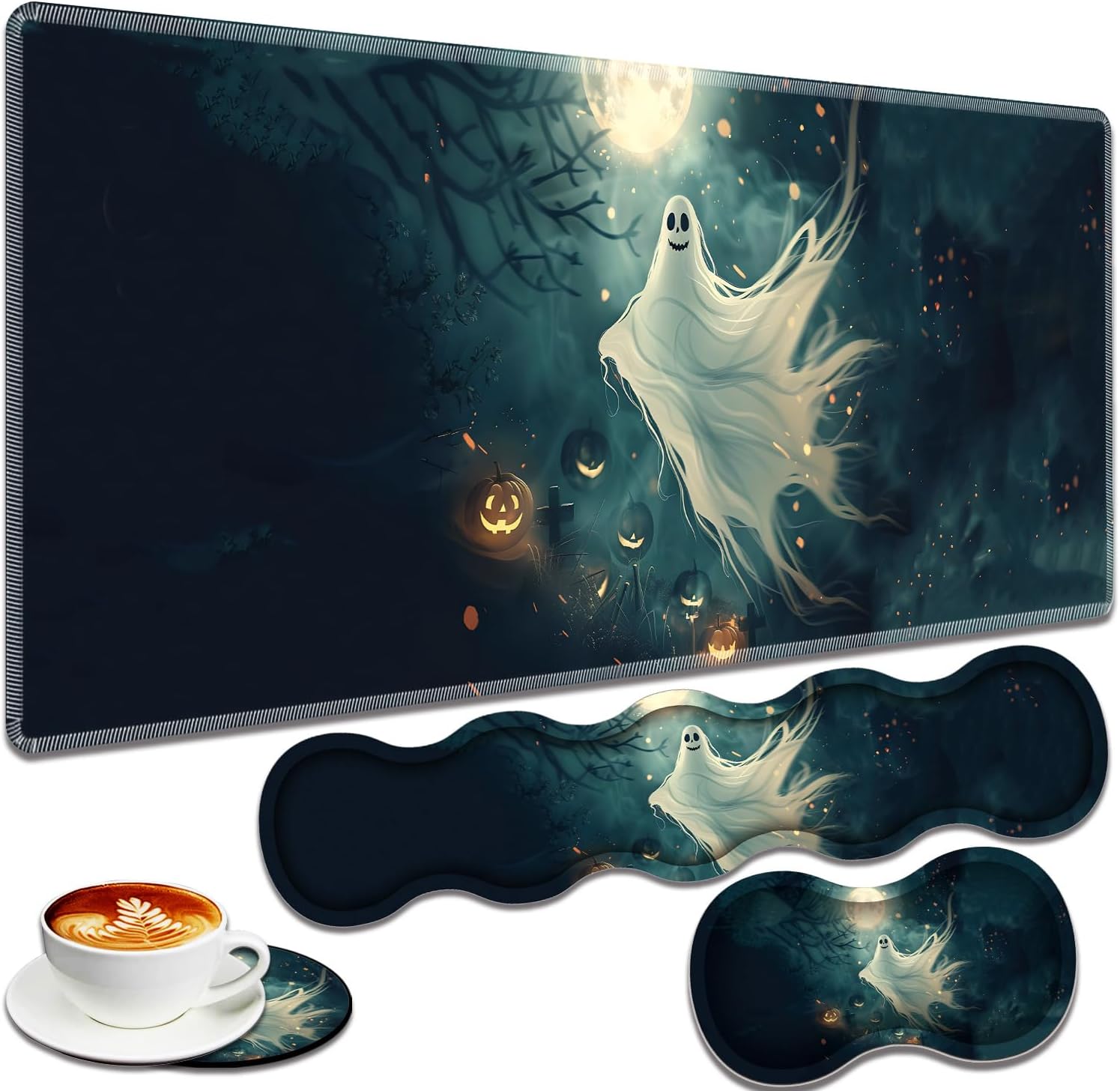VSHSEEOM Mouse Pad 4 in 1 set is your best choice:Using high-quality smooth lycra fabric to allow for more accurate mouse movement, this gaming mouse pad with wrist support is ergonomic and minimizes stress and fatigue on the wrist.Materials:Memory foam, non-slip PU base and Lycra silk surfaceFeatures:1. High quality material: high quality memory foam + breathable neoprene cloth, smooth, comfortable, soft, textured natural rubber material.2. Ergonomic design to relieve wrist pressure and pain.3.4 in 1 set pattern same design. Full color HD printing technology, the pattern is clear and fine.4. Easy to maintain and clean. Suitable for gamers and programmers at home and in the office.Package Included:1*XXL Extended large mouse pad with stitched edge1*Keyboard Wrist Rest1*Mouse Wrist Rest1*Matching Cup Coaster Attention:Our table MATS are made of natural rubber products and have been thoroughly tested for safety. Please feel free to use it. If you have any questions during the use, please contact us, we will help you!